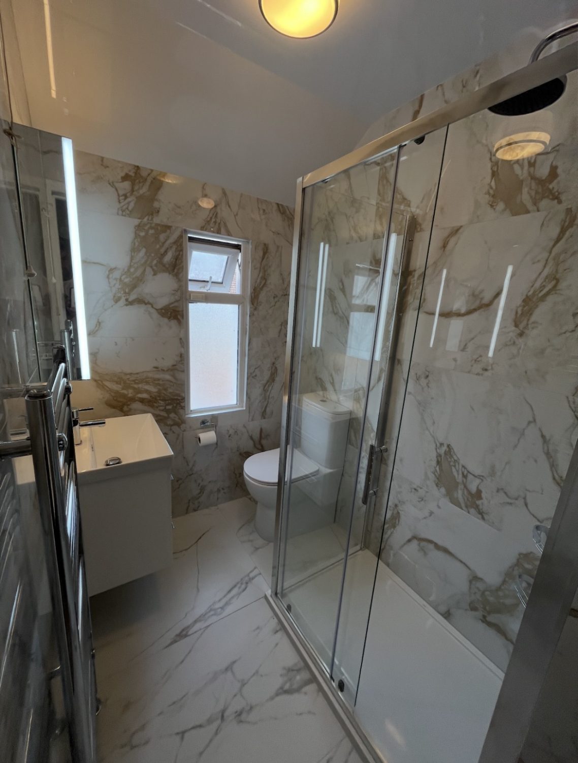 A sleek, modern bathroom finished with marble-effect tiles and a minimalist glass shower, designed to make the most of a compact space.
